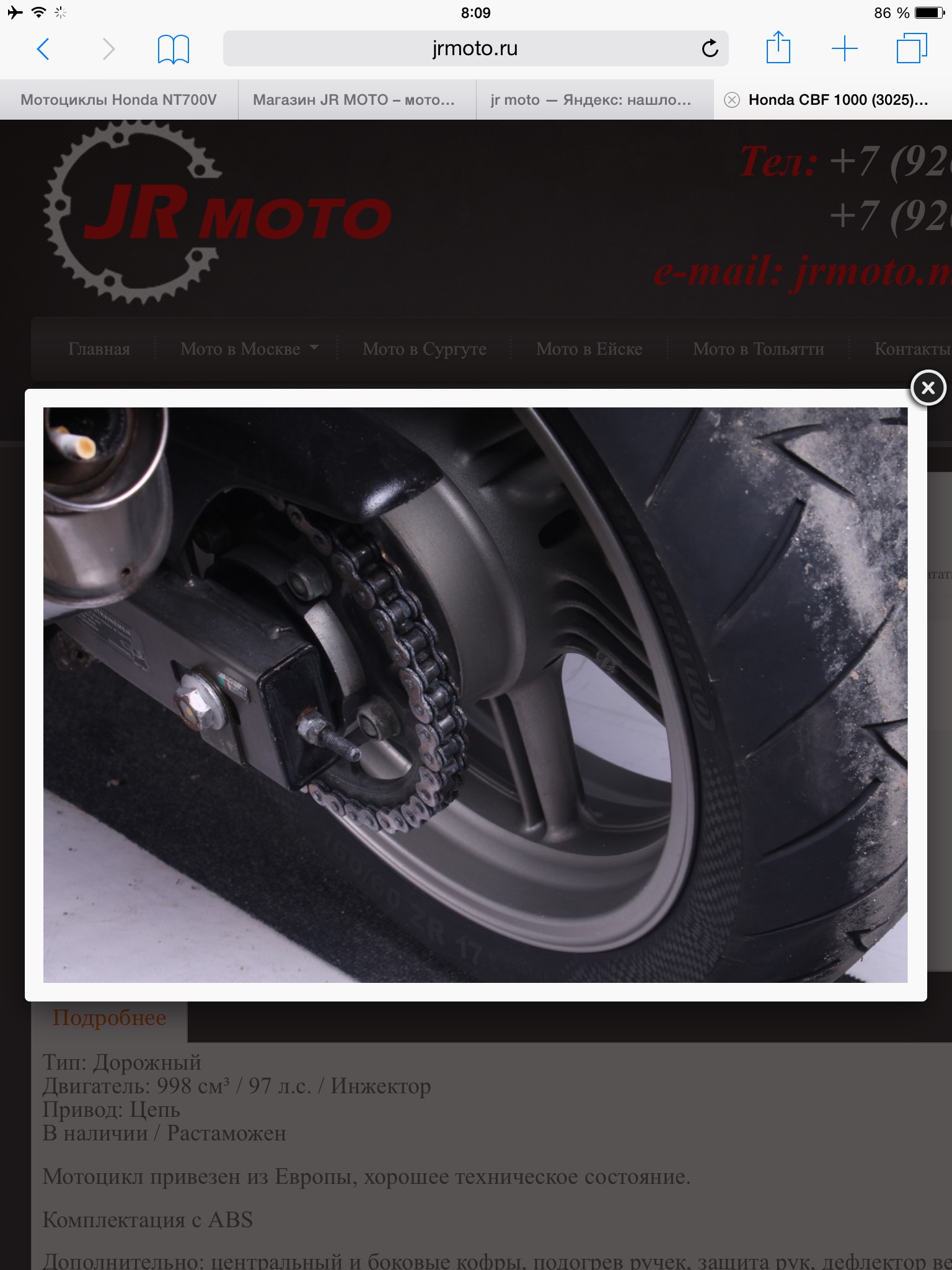 Не хочу поднимать большую шумиху, но учитывая нынешнее повышение цен, было бы не плохо видеть хотя бы уважение со стороны тех или иных продаванов! Ищу для себя третий мот, присмотрел CBF 1000 '06 у этих ребят! Комплектация хорошая, но пробег для 2006 года смешной - 21тыс.км.! Не буду обсуждать честность продавца и пробега, но присматриваясь к деталям скажу-тормозных дисков не осталось! Не 21тыс. пробега явно! Если это первые диски, конечно! Больше поразило другое : на фотографию заднего колеса на сайте компании случайно попал левый глушитель! А в нём СИГАРЕТНЫЕ ОКУРКИ!!! Да, в мотоцикле за 380 труб СИГАРЕТНЫЕ мать их ОКУРКИ!!! Молодцы ребят! Отбили всё желание с вами иметь дело! Скрин прилагается!