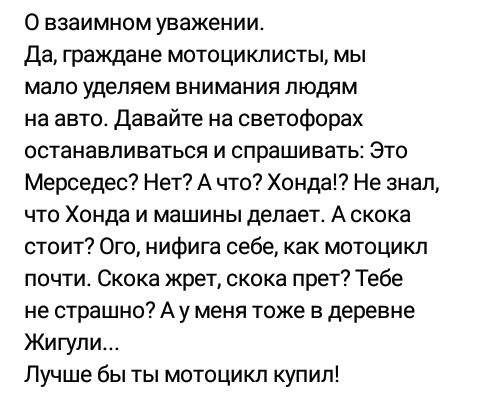 Кстати постоянно наблюдаю что мотоциклисты чересчур настойчивы. Точка хоть и в нарушение пдд, но с поворотникам стояла. Можно было и притормозить.