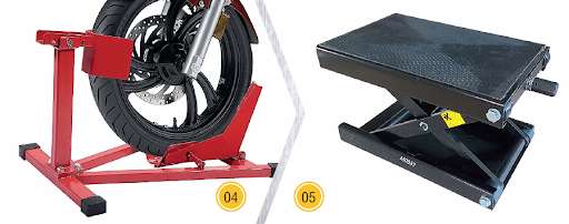 Переднее стянуто и зафиксировано двумя досками. Над мотоциклом стальная труба с крюками. Стропа продета через ручки пассажира сзади и закреплена за эти крюки. Натягивается трещоткой, задница поднимается. Всё.