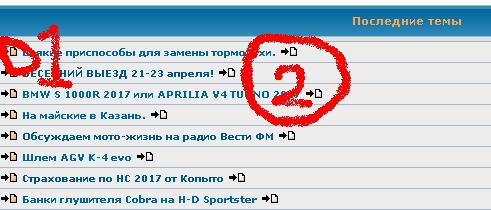 Скрин последних тем на форуме, если нажать на ярлычек помеченный как цифра 1 Вас перекинет на последние сообщения - которые Вы еще не читали, а еслди нажать на ярлычек номер 2 - Вас перекинет на самое последнее сообщение в топике