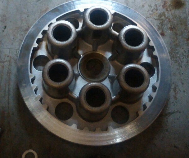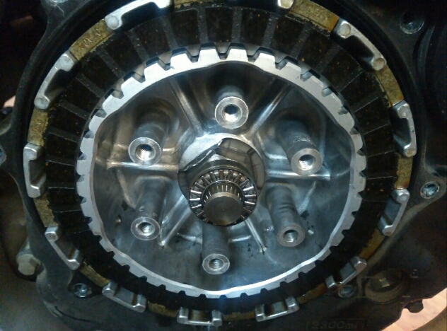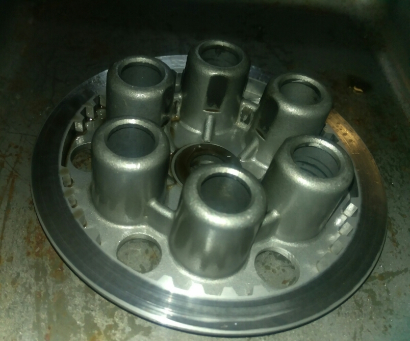 Откручиваем и вынимаем пружины, снимаем крышку корзины и вытаскиваем пакет дисков. В центре виден выжимной упорный подшипник, который приводом через шток в центральной дырке вала отжимает крышку и расслабляет пакет фрикционных дисков Добавлено спустя 3 часа 57 минут 1 секунду: