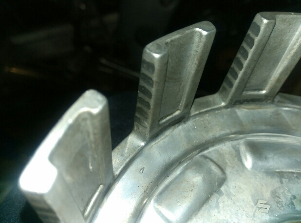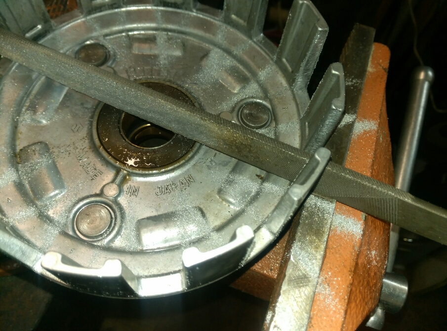 На крупных фото чуть лучше видно, что изначально рабочие грани пазов корзины не плоские а закругленные, и пятно контакта шипа фрикционного диска очень небольшое, практически даже половины толщины корзины нет. И в итоге шип выбивает себе начальную лунку достаточно интенсивно в самом начале а потом процесс замедляется по мере того, как пятно контакта расширяется. В итоге появляется овальная лунка. Я сделал грани плоскими и радиально направленными - точил длинным напильником сразу две грани - противоположные. Если сточить удалось равномерно, то теперь шипы опираются уже на всю толщину стенки корзины и площадь пятна максимальна. То есть интенсивность дальнейшего износа должна быть как минимум не быстрее.