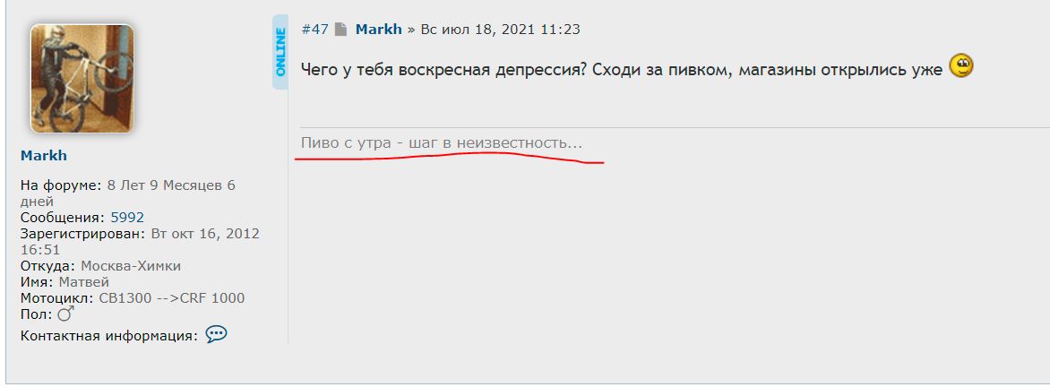 Как это вяжется с твоей подписью?Markh писал(а): Вс июл 18, 2021 11:23 Чего у тебя воскресная депрессия? Сходи за пивком, магазины открылись уже![]()