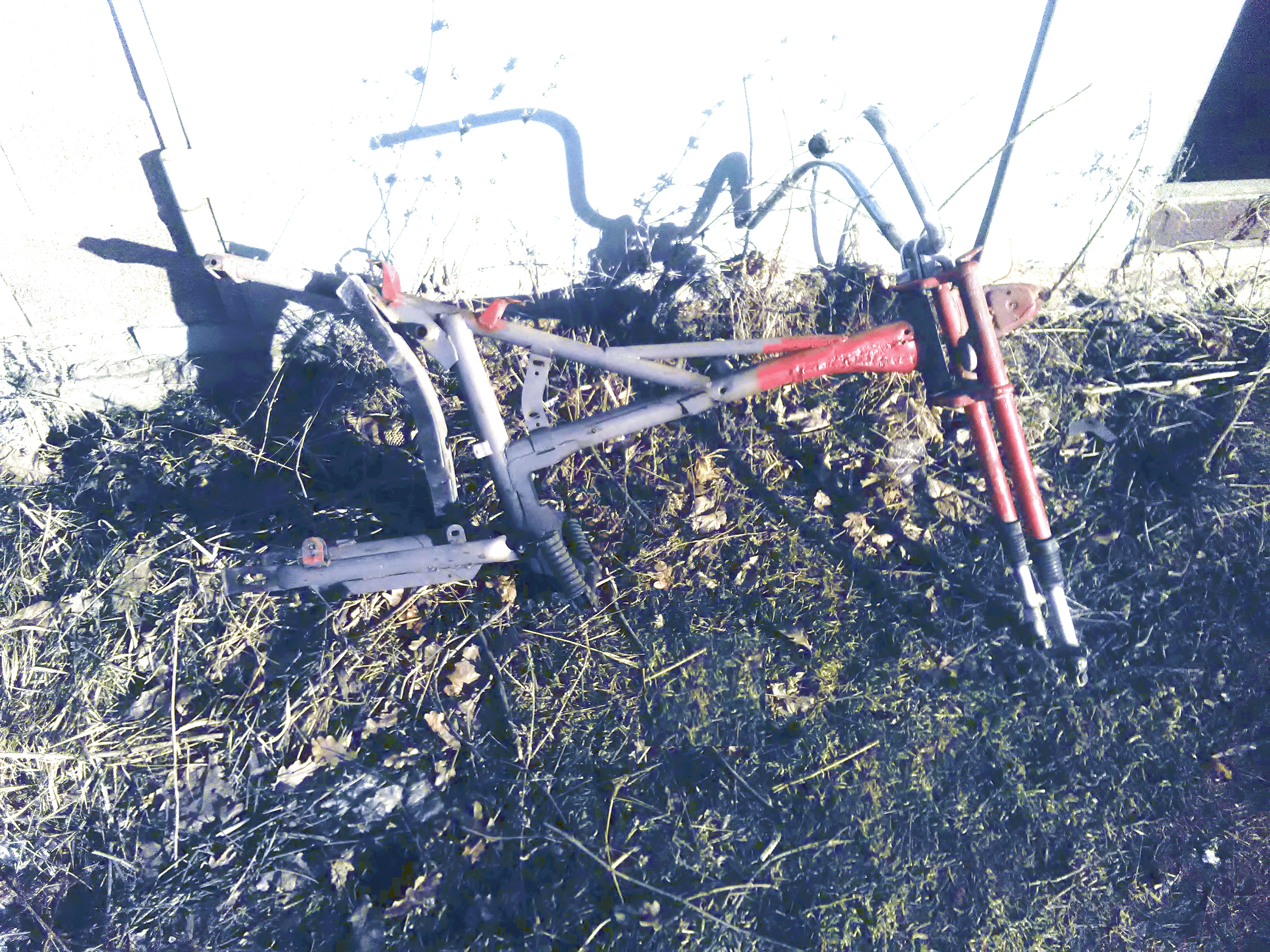 Занялся слесарными работами: снял всё лишнее, отпилил крепления мотора; с распилом рамы торопиться не стал: Меня посетили измены - пугает прочность новой конструкции: Короб строится из четырёхугольников; прямых рёбер жёсткости между узлами нет; толщина труб меньше родного мопедного железа; металл используется мягче... - Может-быть есть смысл сделать короб без разрушения имеющейся перекладины?.. - Перекладина не даст спрятать шлемы. Это возможно - если короб сделать открывающимся со стороны. Но я не могу сообразить образ. Так или иначе - имеющаяся перекладина рамы представляет собой нагромождение треугольников и съедает полезное пространство.