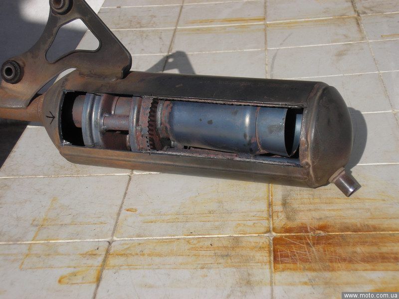 Кстати, вот кое наблюдение было ранее, когда химически чистил глушитель, то погрузил его в таз с горячей водой, чтобы температура дольше держалась и ускоряла реакции внутри. Так вот, увидел в двух точках посередине глушака выходили маленькие пузырьки! Получается,что глушитель старый или дефектный, раз в нем есть микро трещины. Они обе находились со стороны колеса, там метал глушака был словно сошлифован или изъеден, вероятно, песком и водой, летевшими с колеса при езде. Видимо, ему не очень долго осталось.