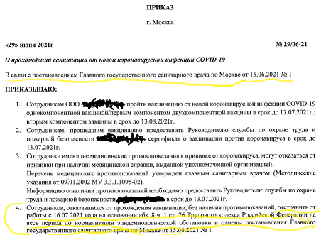 как я слышал в приказах этих ув. членов сказано про вакцинацию порядка 60-70% сотрудников. не 100% или я не то слышал?XPOH писал(а): Ср июл 07, 2021 00:04 А иначе закрытие организации и штраф... опять же на основании Приказов этих уважаемых членов