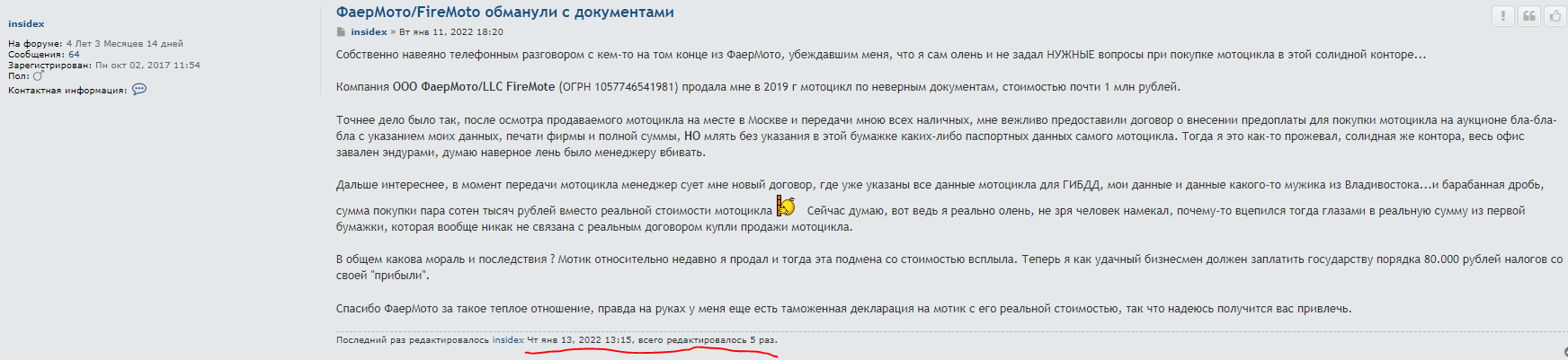ООО ФаерМото/LLC FireMote (ОГРН 1057746541981) продала мне в 2019 г мотоцикл по неверным документам, стоимостью почти 1 млн рублей.