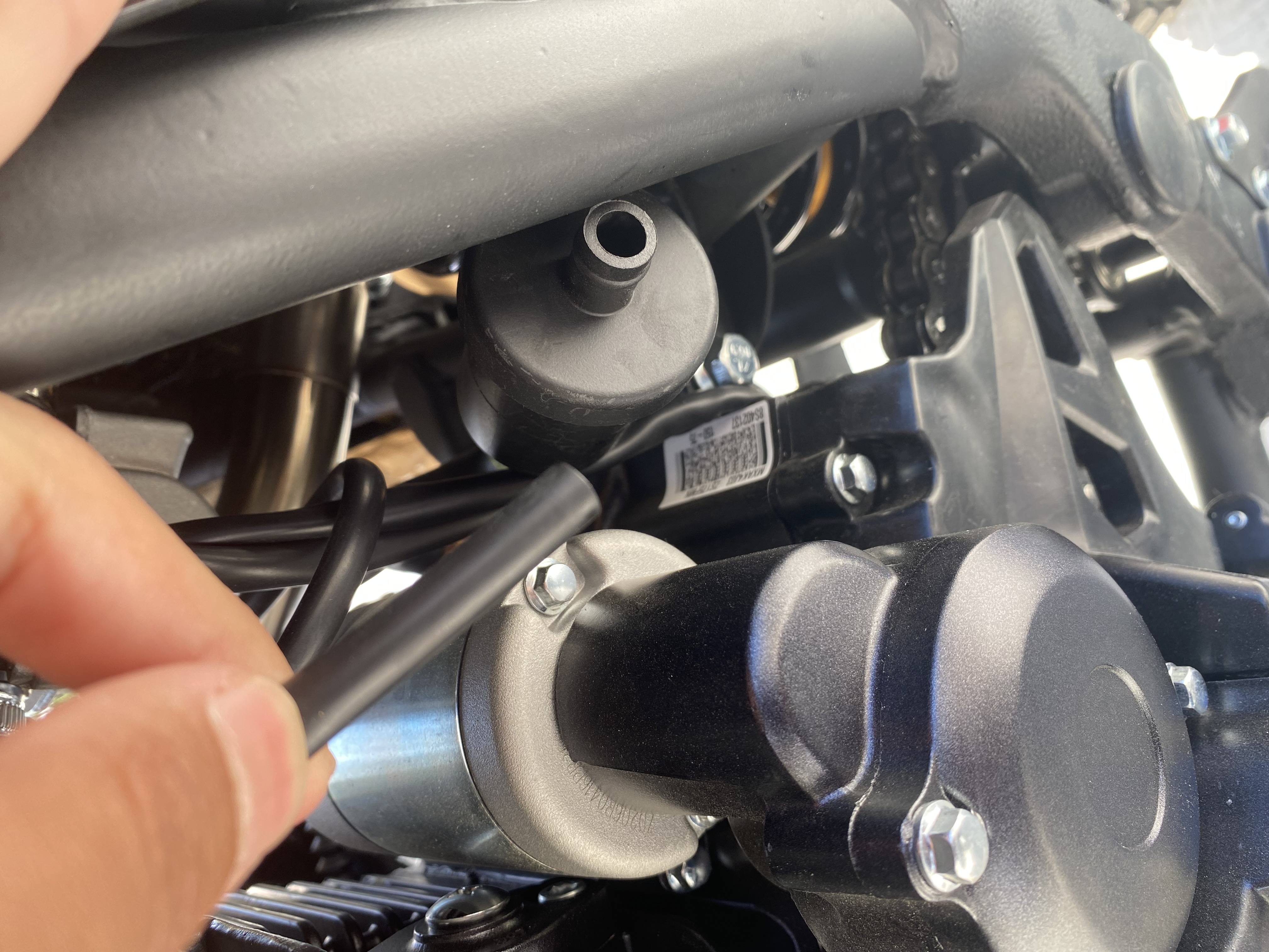 Если вы сфотографируете мотоцикл справа без задней облицовки, то, возможно, будет видно, куда нужно подключить трубку сапуна.