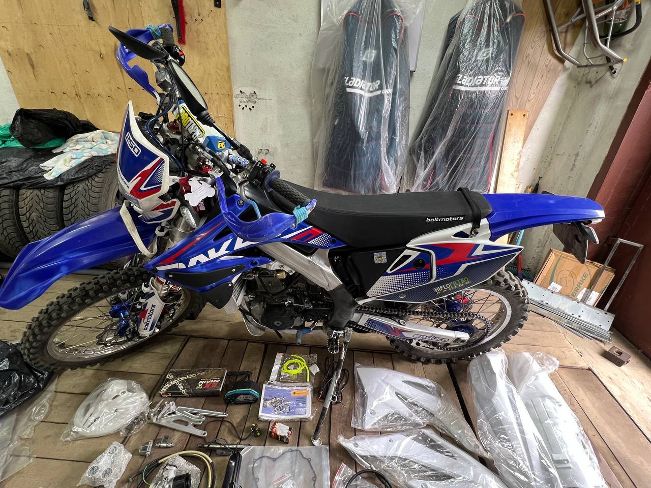 В комплекте к мотоциклу отдам целую коробку новых з/ч: карбюратор, тросики, прокладки, фильтра, колодки, звезды и комплект нового пластика на мот.
