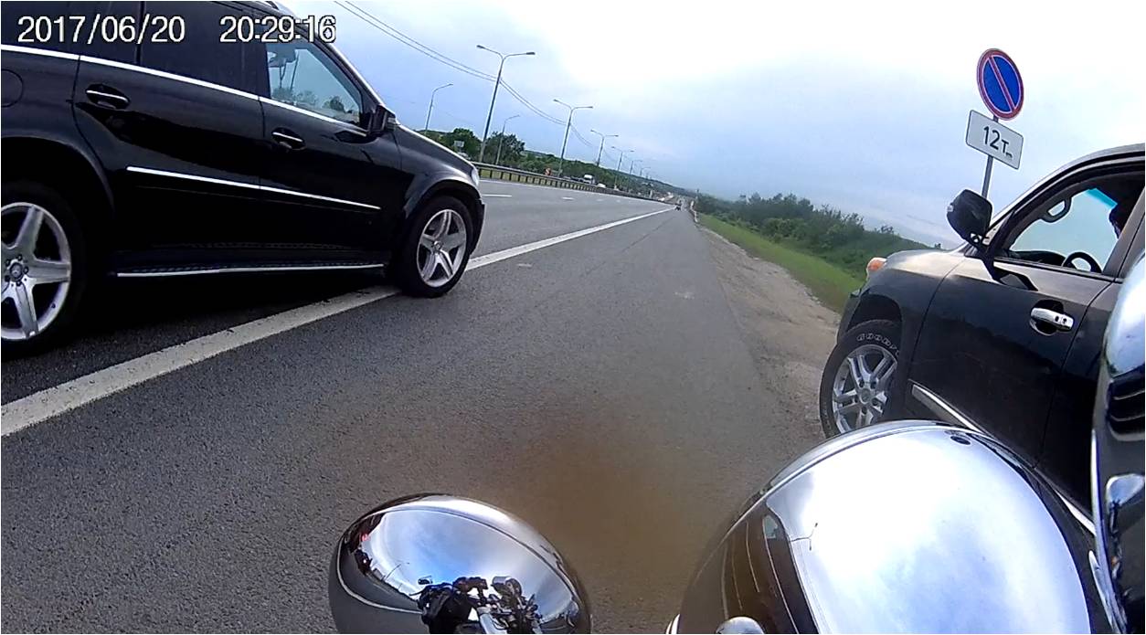 Мотоцикл с видеорегистратором в зеркале этот кипишь увидел и стал останавливаться, этот момент как раз запечетлен на видеорегистраторе.