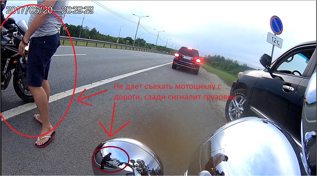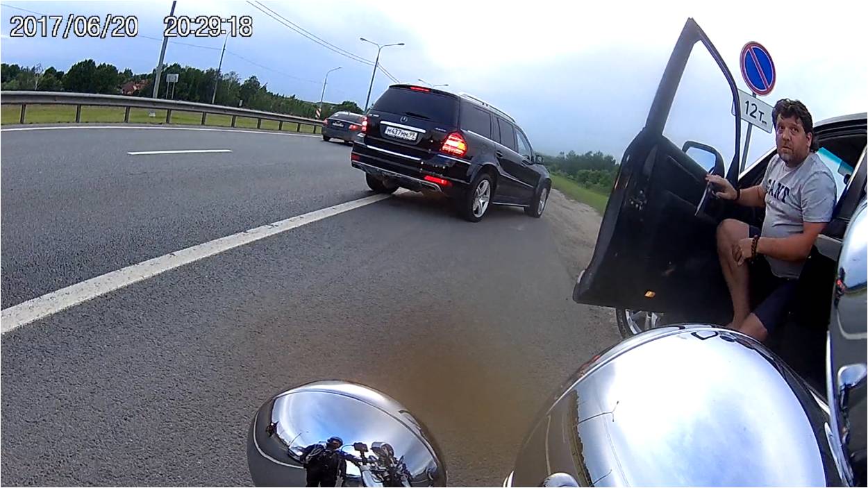 Обратите внимания, когда стали останавливаться все, мы - на мотоциклах, они на машинах - Мерседес не дал проехать нашему замыкающему на мотоцикле в правый ряд для остановки, хотя мотоцикл был впереди (!!!) автомобиля, он просто полез вперед не пропуская, еще и посигналил (я уже писала, что это видно в отражении люстры на моте с видеорегистратором), а затем вышел водитель из машины и не дал мотоциклисту вообще съехать с дороги на обочину, так и стоял мот на дороге в правом ряду, за ним стояла грузовая машина и даже сигналила, пока водитель Крузака не ушел.