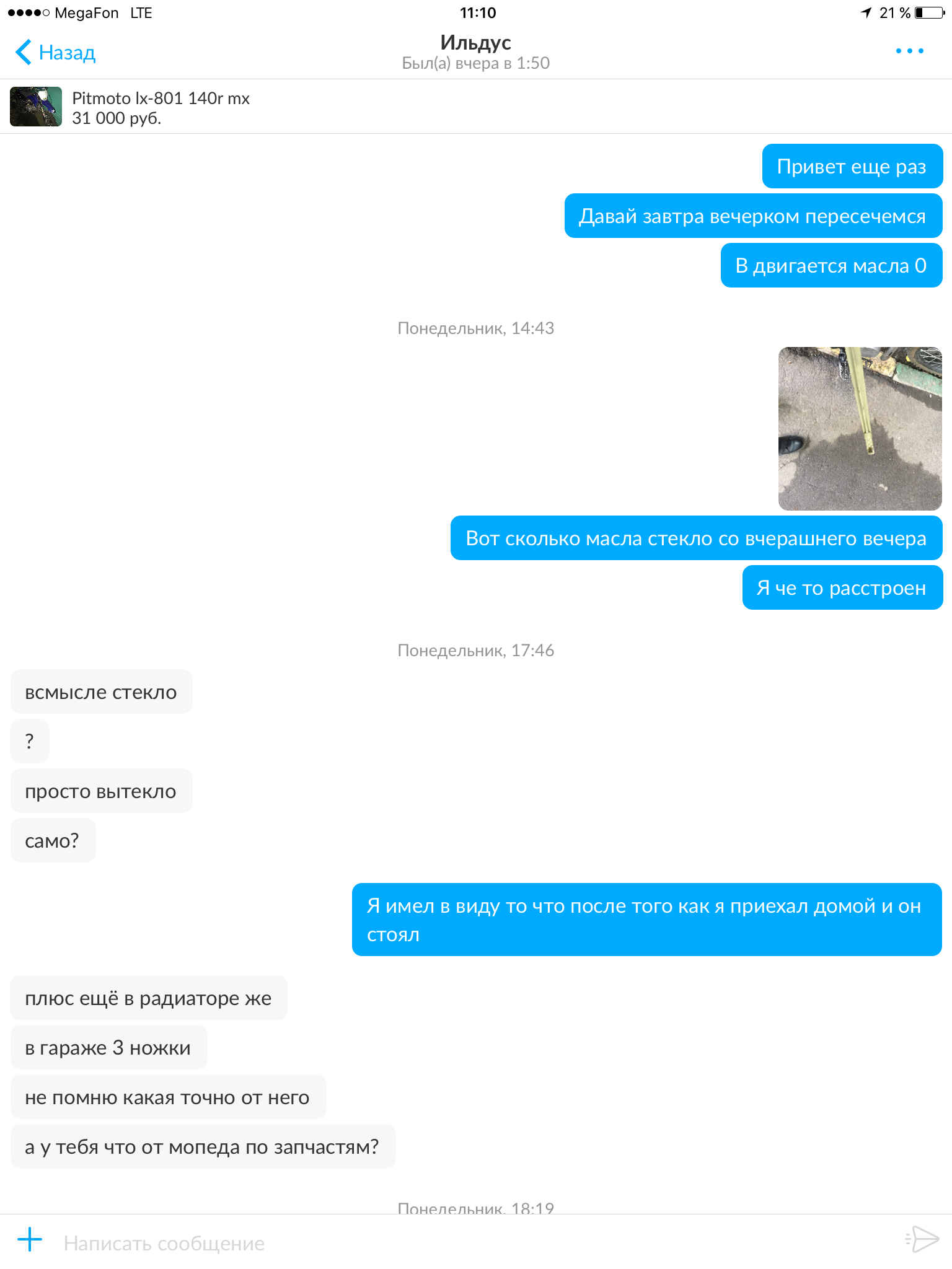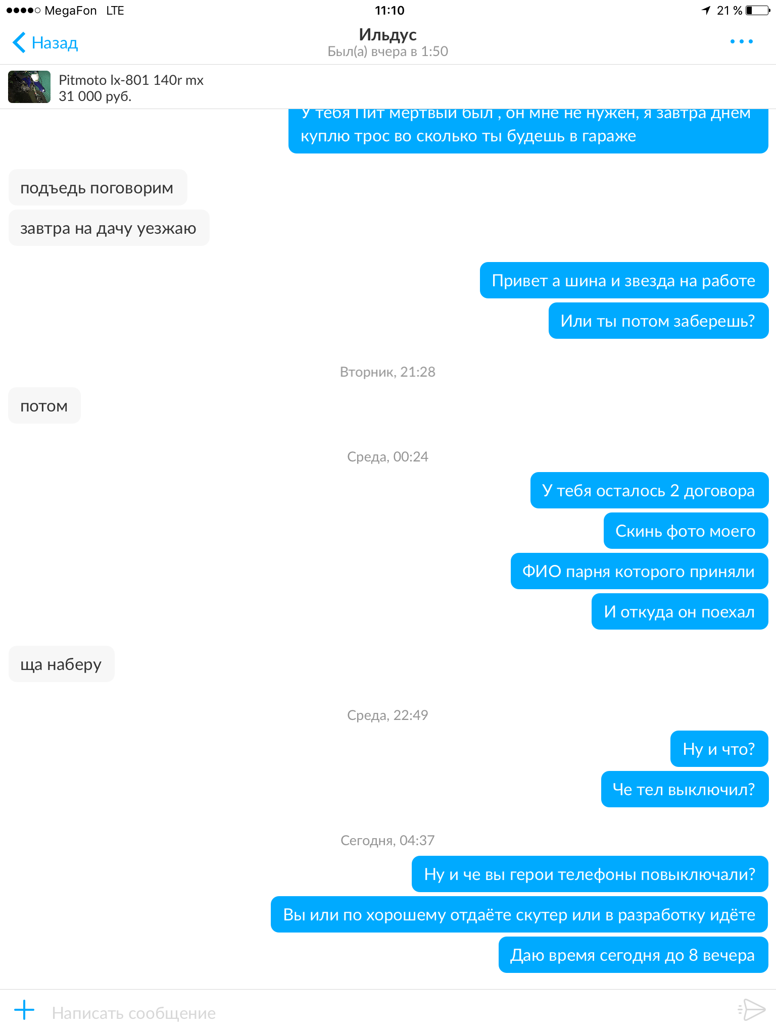 Произошла такая ситуация, продавал я свой скутер и смотрел варианты обмена на питбайк, вот ссылка на моё объявление https://www.avito.ru/moskva/mototsikly_ ... 1099968971