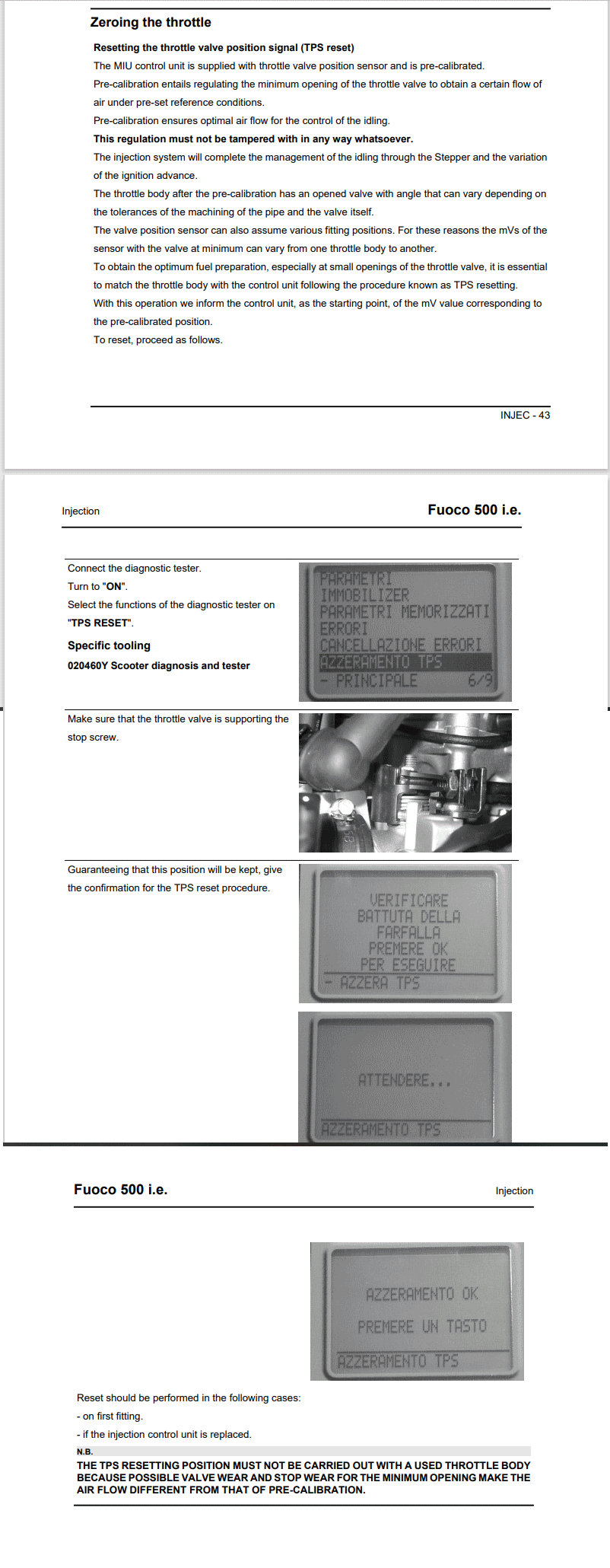 Один мануал для "обывателей" "Gilera_Fuoco-MP3 500(USA) User Manual", а вот второй для сервисных работников "Gilera_Fuoco Workshop Manual". Открываешь сервисный мануал. На 239 странице (страница PDF ридера, а не самой книжки. В книжке странице обозначена как "INJEC-43"). Там заголовок "Zeroing the throttle" (сброс дросселя). Дальше там картиночки и пункты, по типу: Resetting the throttle valve position signal (TPS reset) (Сброс сигнала положения дроссельной заслонки) и т.д.