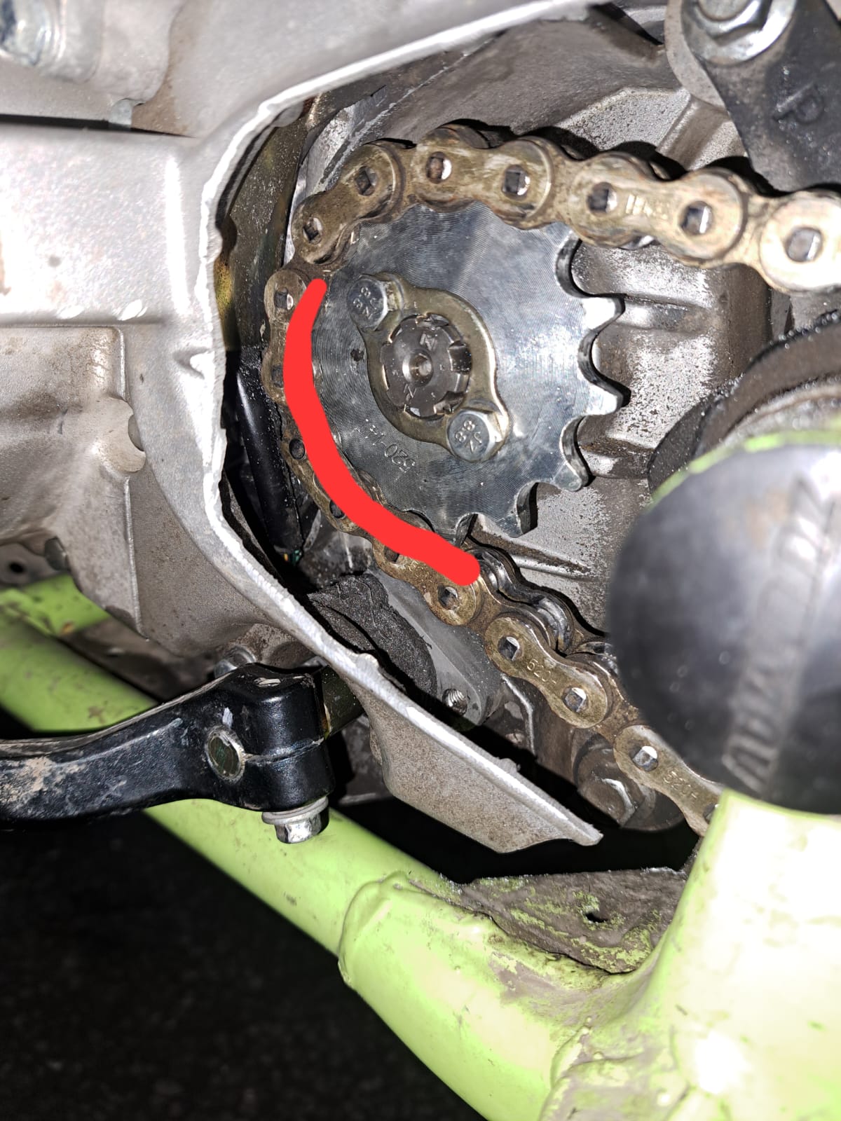 Сама звезда на вал садится и все там хорошо. НО! С цепью уже не лезет, цепляет звеньями за картер. Несколько ударов молотком и узел собран как и планировалось. (Нужно отломать кусок тонкой стенки картера снизу) Очковал, но подействовал девиз эндуриста: "вижу цель- не вижу препятствия"